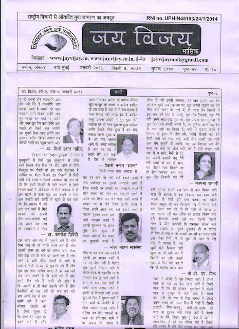प्रिय मित्रों मुझे बताते हुए बहुत ख़ुशी हो रही है कि मेरी ग़ज़ल जय विजय ,बर्ष -२ , अंक ४ ,जनबरी २०१६ में प्रकाशित हुयी है . आप भी अपनी प्रतिक्रिया से अबगत कराएँ .